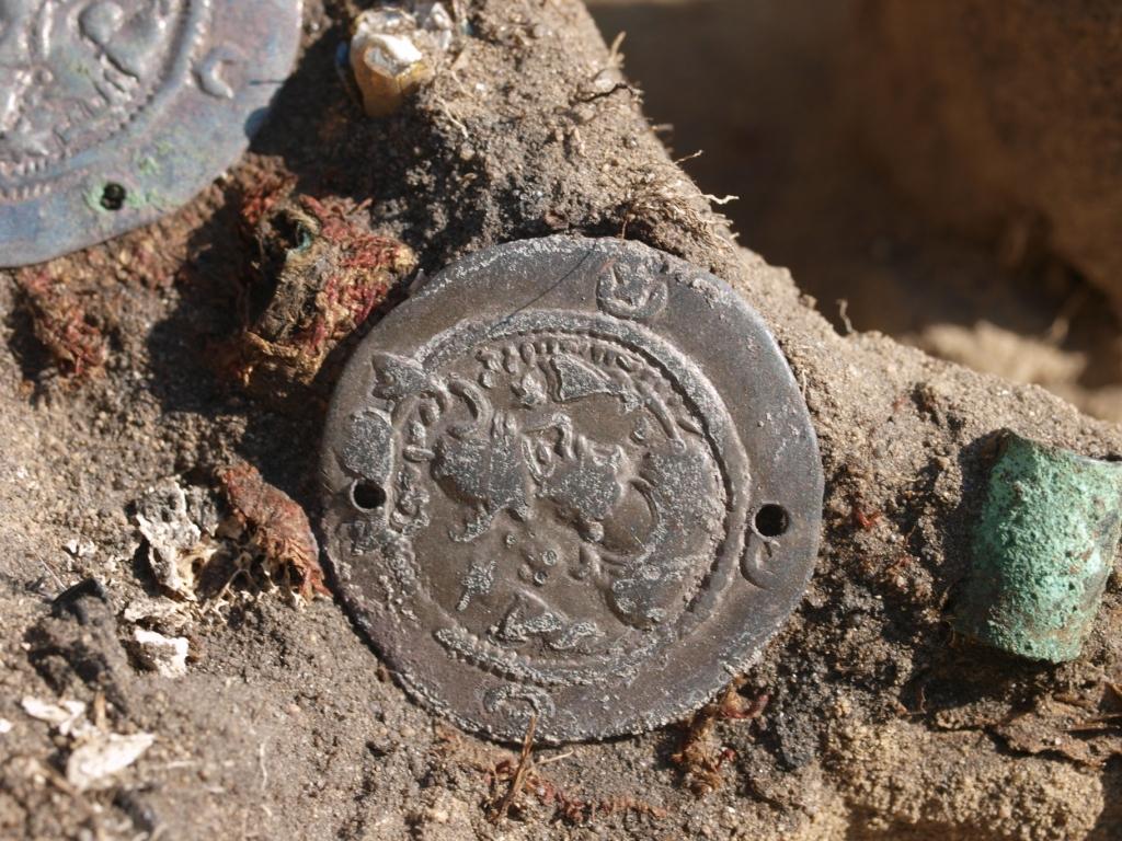 Фрагмент налобной повязки с нашитыми на неё монетами династии Сасанидов. Погребение 8 - 9 веков. Крохалёвка-13